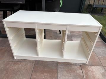 Dit is een witte ikea trofast kast. De kast heeft meerdere gleuven voor bakken. Er zitten een paar beschadigingen aan bovenkant en de zijkant . De bakken zitten er niet bij.