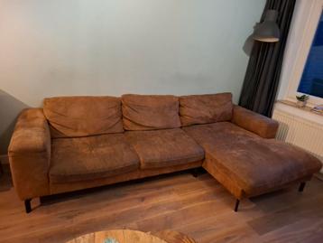 Bruine nepleren hoekbank met flink aantal vlekken, zoals te zien op de foto's. Zwarte metalen poten. De bank is 2,67 breed, 90 cm diep en het lange zitgedeelte is 150 cm diep. De zithoogte is onge