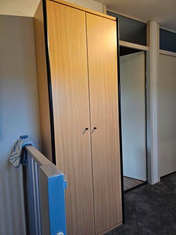 Kantoor/boekenkast met deuren. 2 Horizontale lijsten front zwart kunststof beuken fineer gebruikt hoogte: 220 cm, breedte: 76 cm, diepte 37 cm kast reeds gedemonteerd. Bouwinstructie mondeling (of sch