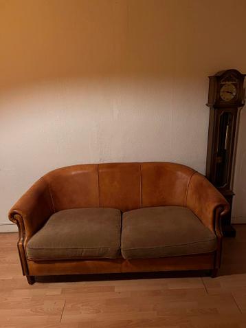 Prachtige vintage tweezitsbank, bekleed met cognacbruin leer en comfortabele stoffen zitkussens. Deze bank heeft een klassieke uitstraling met mooie details zoals de nageltrim aan de zijkanten. Perfec