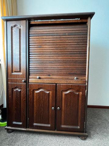 Mooie eikenhouten computerkast met veel opbergruimte. De kast is 145cm hoog, 107cm breed en 62cm diep. Ideaal voor een thuiskantoor of studeerkamer. Biedt ruimte voor een computer, printer en andere a