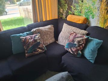 Hoekbank met 8 zitplaatsen bestaat uit 2 banken met 3 zitplaatsen 1 extra bank stuk 1 zitplaats en de hoek zit. Nep leer van de bank is gaan vervellen en zodoende hoezen erop gedaan. Ookal is t leer v