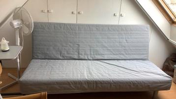 Grijze slaapbank in goede staat. Je kunt er met drie personen op zitten en uitgeklapt met twee personen erop slapen. Aan de zijkant van het bed zitten kleine vakjes. Het matras heeft een hoes die eraf