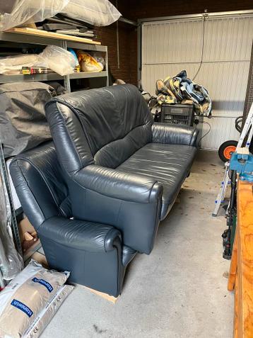 Twee leren banken. Een tweezitsbank en een driezitsbank. Ze zijn gebruikt en hebben wat gebruikssporen. Het leer is donker van kleur.
