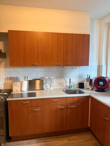 Deze hoekkeuken heeft bruine kasten en een licht gespikkeld aanrechtblad. Er zijn drie bovenkasten en vier onderkasten. De keuken kan nog een ronde mee. Gaat weg ivm nieuwe keuken.