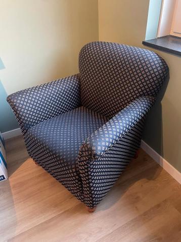 Te koop: klassieke fauteuil met donkerblauw geruit patroon en houten pootjes. Gebuikte staat, maar goed zit comfort. Gratis ophalen in voorschoten.