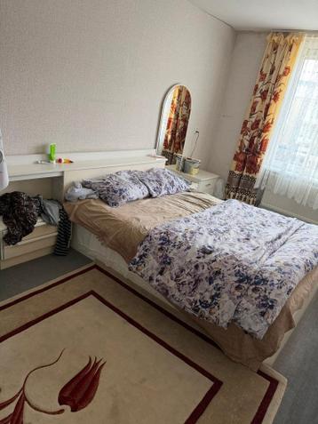 Een tweepersoonsbed met een wit hoofdbord. Aan beide zijden van het bed zijn nachtkastjes geïntegreerd in het hoofdbord. Het bed is wit van kleur. Zonder matras
