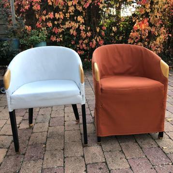 6 design eetkamerstoelen in 3 kleuren: blauw, oranje, roze. Alle stoelen moeten opnieuw bekleed worden. Het stukje hout aan het uiteinde van de armleuningen kunnen afgeschroefd worden en de gehele kle