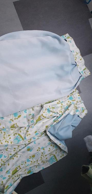Uiltjes motief. Verduisterend. Geplooid 150 cm breed (2 keer, totaal dus 3 meter) hoogte ongeveer 150 cm. Inclusief ophanghaakjes. Let op: onderzoom is losgehaald, moet zelf vastgezet worden.
