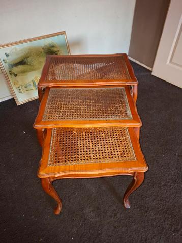 Set van drie bijzettafeltjes. Het grootste tafeltje is 60 cm lang, 40 cm breed en 50 cm hoog. De tafeltjes hebben een houten frame en een rieten blad.