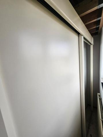 Gratis ophalen! Ruime kast 2.06Cm br x 60cm d x 220cm h, kleur creme. 2 Schuifdeuren waarvan 1 spiegel, 3+3 legborden en 2 hangrails. Moet worden gedemonteerd (op 1e etage).