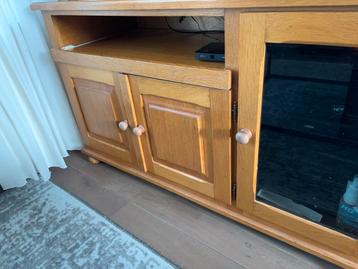 Mooi massief eiken tv meubel met een handig uitschuifbaar open deel voor bijvoorbeeld een mediabox of spelcomputer. Het meubel biedt veel opbergruimte achter de deurtjes, ideaal voor het netjes opberg