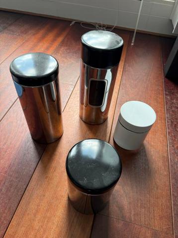Deze set bestaat uit vier handige keukenbussen, ideaal voor het bewaren van koffie, thee, suiker of andere droge etenswaren. Drie bussen zijn gemaakt van glanzend roestvrij staal met een zwarte deksel