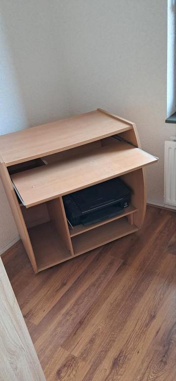 Dit buro is nog prima en kan vandaag gratis worden opgehaald. Het heeft twee niveaus en een paar vakken onderin. Er staat een printer in een van de vakken.