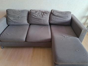 Gratis af te halen! Stoffen grijze bank, 2 zits met daarnaast een lounge gedeelte. Bank is op de hoeken wel hier en daar wat beschadigd. Alle kussenhoezen kunnen worden opgeritst. De bank is 2 meter l