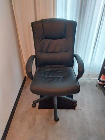 Een zwarte bureaustoel met armleuningen. De stoel heeft wieltjes en is in hoogte verstelbaar. De stoel kan wel omhoog maar zodra je erop gaat zitten zakt hij naar benenden. De stoel zit nog wel heerli