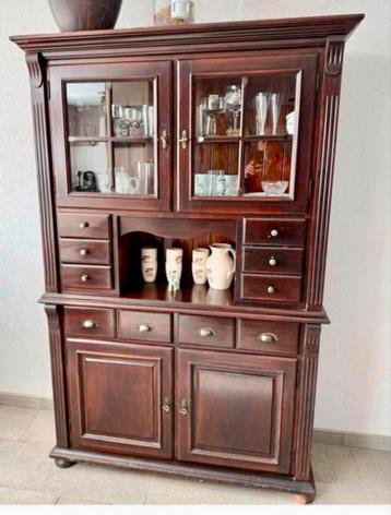Mooie donkerbruine buffetkast met glazen deuren bovenaan en dichte deuren onderaan. De kast heeft ook verschillende lades. Er is ruimte voor spullen achter het glas en in de lades.