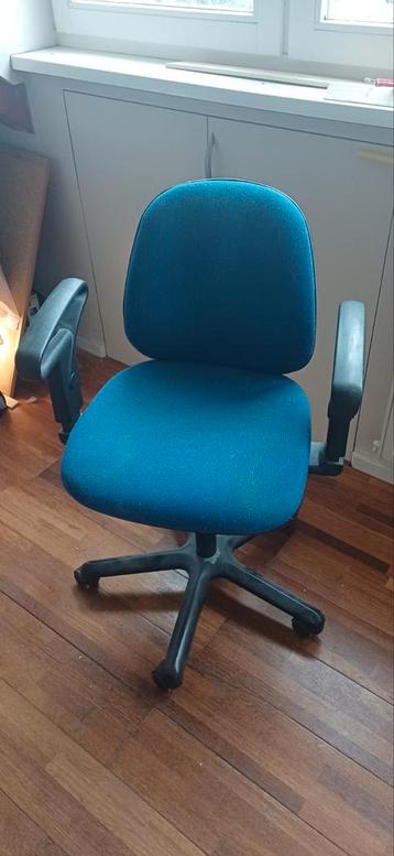 Een blauwe bureaustoel met een stoffen zitting en rugleuning.