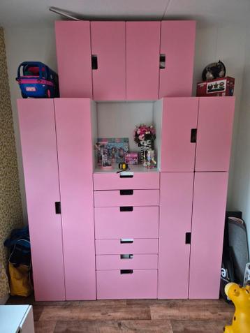 Complete stuva kastencombinatie, bestaande uit 2 hoge kasten met roedes en lades, 2 sets van 3 lades op elkaar, en 2 kleine kasten. De kasten zijn aan elkaar geschroefd. Ze zijn gebruikt, maar in nett