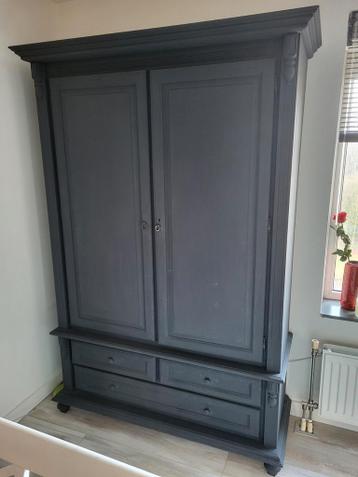 Mooie houten kast in een antraciet zwart/grijze kleur. De kast is in nette staat en biedt veel opbergruimte. Perfect voor diverse interieurstijlen. Afmetingen ongeveer hoogte 210 breedte 135. Diepte b