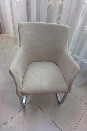 4 bruine gemêleerde eetkamerstoelen zonder armleuningen en 2 beige gemêleerde eetkamerstoelen met armleuningen. Ze passen bij elkaar aan een eettafel. Het zijn sledestoelen met roestvrijstalen frame.