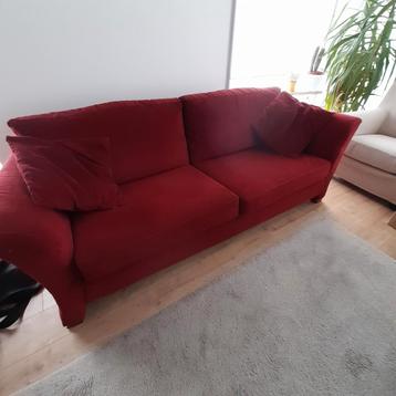 Rode bank met nog goede, stevige zitkussens. Afmetingen: breedte 220 cm, diepte 95 cm, hoogte 80 cm.