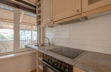 Deze keuken is zonder apparatuur. De keuken heeft lichte kastjes en een donker aanrechtblad. Er is een spoelbak aanwezig. De keuken heeft zowel boven- als onderkasten en een hoge kast.