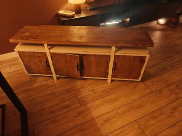Tv meubel met 4 deurtjes. Altijd netjes onderhouden en dus ook nog in prima staat. Het lijkt alsof er beschadigingen op de kast zitten maar dat is de look. Afmetingen: 150cm lang, breed 60 cm, hoog 39