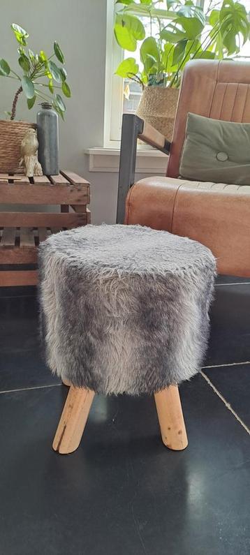 Leuk krukje met harige bekleding en houten pootjes. Ideaal als extra zitplek of decoratie. Gratis af te halen!
