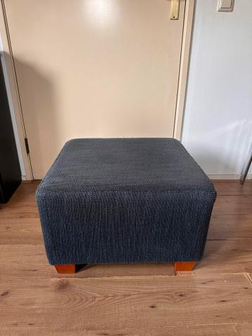 Een donkerblauwe poef met een stoffen bekleding. De poef heeft vier houten pootjes. De stof heeft een lichte textuur. De poef is vierkant van vorm