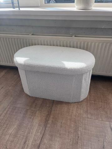 Witte teddy stof poef. De poef heeft een ronde vorm. Er zit een vlek op de stof, zie foto. De onderkant is zwart.