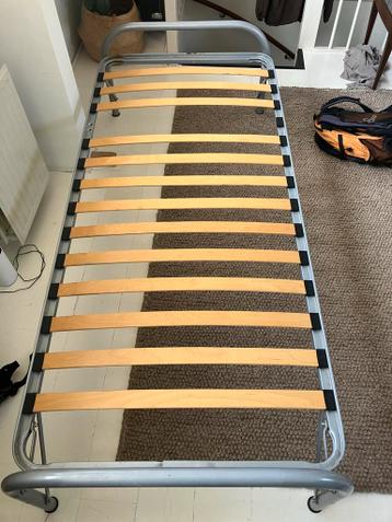 Dit is een gebruikt onderschuif bed van 90x200 cm. Het bed heeft een metalen frame en houten latten. Het is een eenpersoonsbed. Mist 1 lat (zie de foto). Vouwt mooi klein op.