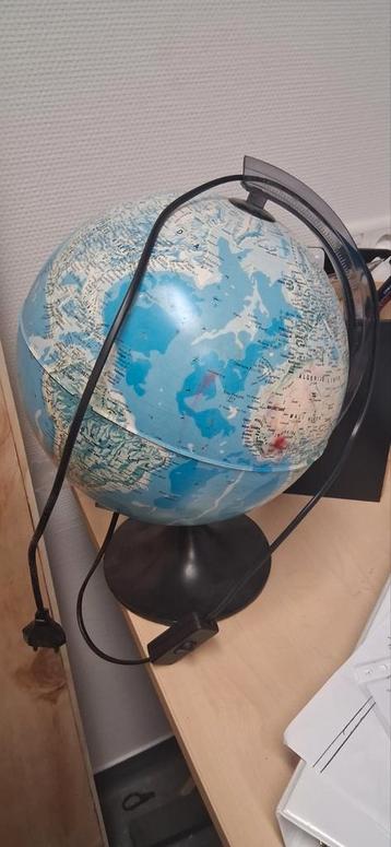 Een wereldbol met een zwarte voet en een zwarte boog. De bol heeft een lichtfunctie met een snoer en een aan/uit-schakelaar. De landen en zeeën zijn duidelijk zichtbaar.