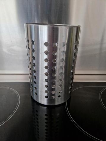Deze roestvrijstalen bak is handig voor het opbergen van keukengerei. Er zitten gaten in de zijkant. De bak is ongeveer 18 cm hoog en heeft een diameter van ongeveer 12 cm.