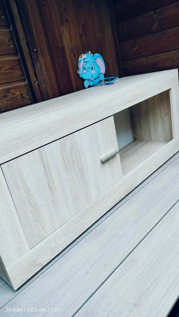Deze tv kast heeft een lichte houtkleur en een schuifdeur. Er is een open vak en een afgesloten vak. Open vak heeft ook lad .lad ziet er binnen .er zit een gat in de achterwand voor kabels.