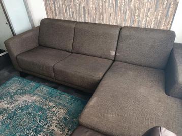 Bruin stoffen hoekbank in nette en schone staat. 1 Veer is geruime tijd geleden los gesprongen en zelf toen gerepareerd. Verder is de bank nog helemaal in orde en zit goed. (De lichte plekken zijn gee