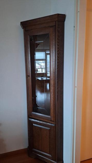 Hoekkast donker eiken . Met glazen deurtje. En 1 dicht deurtje 170 cm hoog 70 cm breed 40 cm diep in het midden.