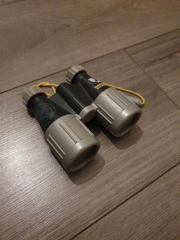 Dit is een verrekijker van national geographic. Hij is zwart met grijze accenten en heeft een geel koord. De verrekijker is te zien op de foto.