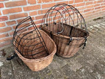 Twee fietsmandjes voor een kleine hond. Eén mandje is voor aan het stuur en de andere is voor achterop de fiets. Beide mandjes zijn van riet en hebben een metalen koepel.