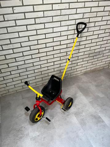 Leuke driewieler met duwstang en gordel. Opknapper, voorwiel schiet los van het frame. Voor de handige klusser.