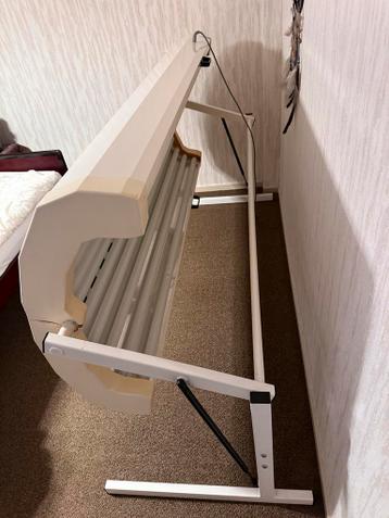 Deze zonnebank is enkelzijdig en heeft 15 lampen of meer. Hij is gebruikt en wat gedateerd. De lampen zijn zichtbaar en lijken in orde. Op te halen in well (limburg).