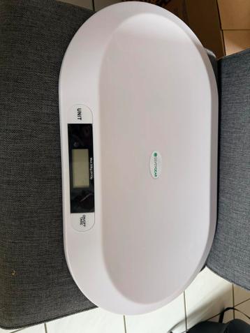 Deze silvergear babyweegschaal is wit en heeft een digitaal scherm. Er staat 'max 20kg d=10g' op het scherm. Er zijn ook knoppen voor 'unit' en 'on/off tare'.