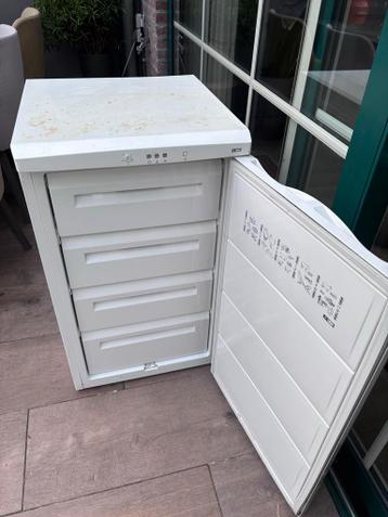 Deze nordland vriezer heeft vier lades. De vriezer is wit en heeft een draaiknop aan de voorkant. Er zitten wat vlekken op de bovenkant en voorkant. Werkt nog prima