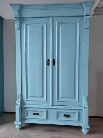 Oude grenen kast met legplanken en 1 lade in nieuwe frisse kleur lichtblauw diep: 47 cm hoog: 179.5 Cm breed: 105 cm, bovenaan (lijst) 114 cm