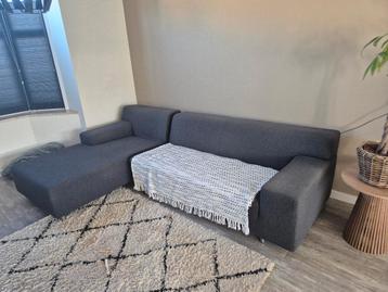 Donkergrijze hoekbank. Ca 270cm breed, hoekgedeelte ca 170cm. Stof op zitting gerafeld op 1 plek.