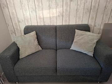 Een grijze tweezitsbank met stoffen bekleding. De bank heeft twee zitkussens en twee rugkussens. Er zitten twee sierkussens op de bank, deze zijn lichtgrijs en geribbeld. Vorig jaar nog gestoomd, leun