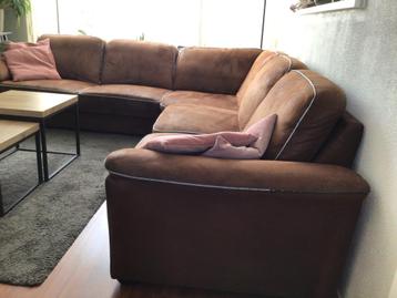 Bruine heerlijk zittende hoekbank. In goede staat, niet kapot alleen de omranding, zie foto, zijn deels versleten. Kan best nog een hele tweede ronde mee. Afmeting 275 x 275 cm diepte zitvlak 54 cm