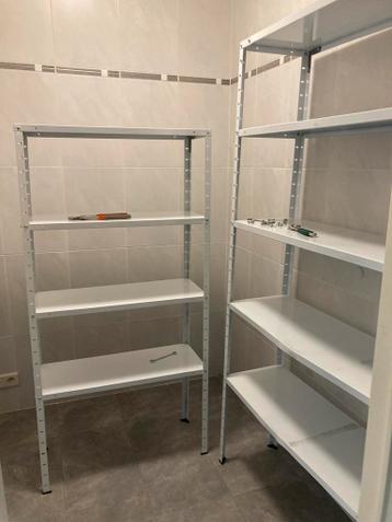 Gratis op te halen; twee stellingkasten, wit van kleur. Ze hebben elk vijf planken. De kasten zijn van metaal en staan op plastic voetjes. Kleine kast; hoogte 150 cm, breed, 75 en diep 30 cm. Grote ka