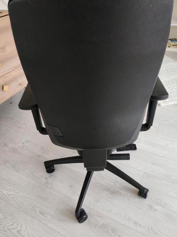 Gebruikte zwarte bureaustoel met zichtbare slijtage en een scheur in de zitting. De stoel is nog functioneel en kan gebruikt worden. Alle functies werken volledig