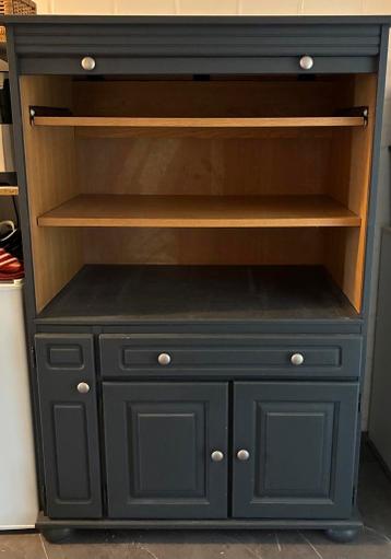 Leuke, petrolblauwe, computerkast/buffetkast voorzien van zilverkleurige knopjes. Afmetingen: 156 cm x 67 cm x 100 cm. Roldeur werkt niet meer, maar kan wellicht opgeknapt worden. Blad is uitschuifbaa